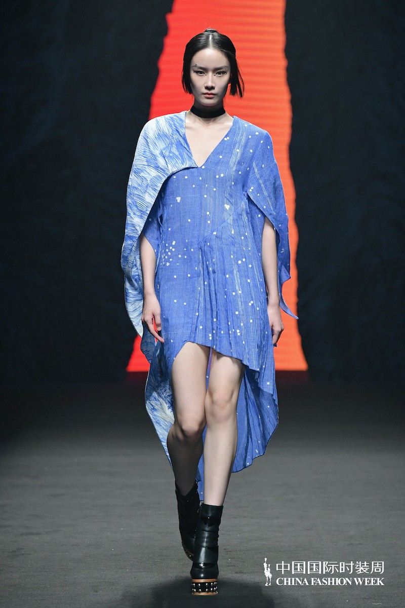 开场视频中,元宇宙机械姬仿佛置身于古今面料组成的时空隧道中,以未来的视角探索着人类纺织文明。沉浸式的巨大抽象肌理缝隙中,闪现出一道从物质世界穿越到精神世界的光芒。来自雕塑艺术家任哲与ZIFEI WANG跨界联合的颇具虚灵意向之美的舞台设计,让全场观众仿佛穿梭在时空的洪流,共同见证着两个时代的碰撞。当机械姬在机器学习完成后,大秀正式开始。秀场的模特仿佛行走在异度宇宙空间里,探索着对未知的好奇与渴望、赞叹与惊喜,时代界限亦在此模糊。ZIFEI WANG再一次用独有的时装语言表达对人类终极命题的理解和想象,开启品牌通往未来的征途。