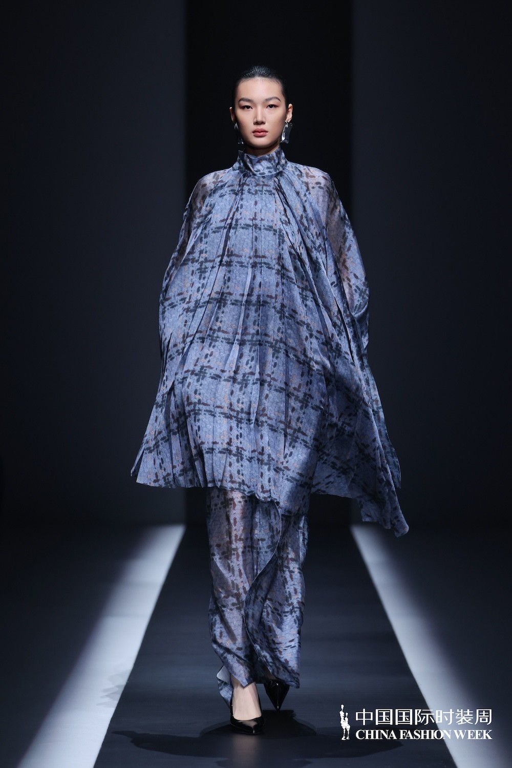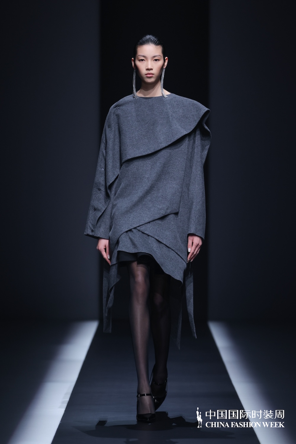 秀场之上,灯光渐亮、旋律奏响,模特身着玫粉色长款大衣,搭配压褶工艺打造的白色花瓣裙优雅登场,将“我”对世界最初的懵懂感知,悄然藏于衣物肌理之中;随着旋律鼓点逐渐加重,象征着成长历程的推进,服装色彩从明艳热烈的玫粉,渐变为低调内敛的炭灰、中灰与浅灰蓝。颈部缠绕的线条、肩部利落的轮廓、胯部扩张的结构、衣身斜向交错的剪裁,生动勾勒出成长路上和谐与冲突共生的状态;最终,以克制沉稳的酒红色调、舒展自在的服装造型,呈现出当下“我”对世界的成熟理解与全新感知。此外,设计师宋双以独特的设计语言,重新演绎16世纪拉夫领与中世纪欧洲裙撑经典元素,融合建筑美学结构特点,打造出极具空气感的造型,成为秀场一大亮点。