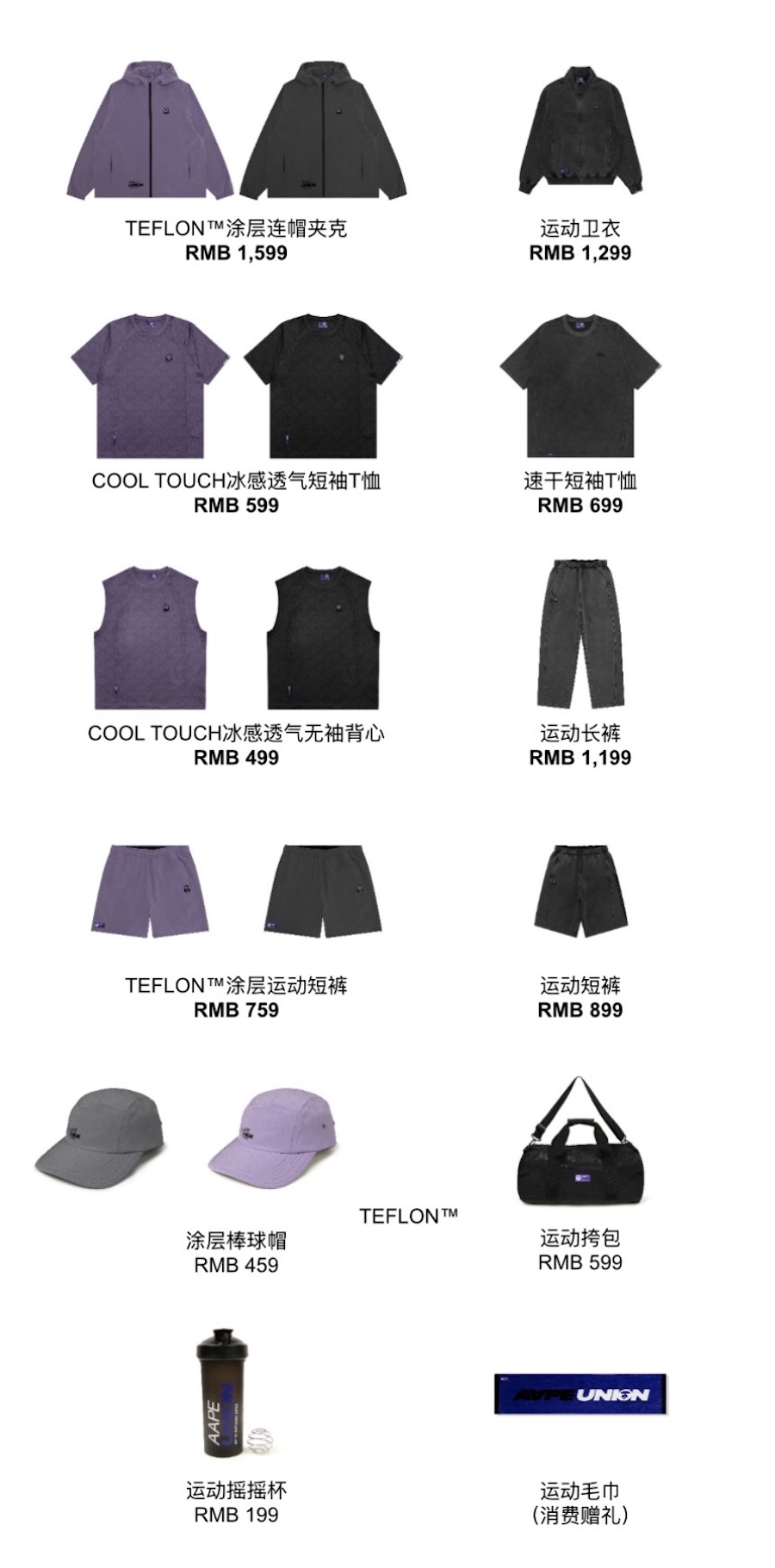 产品矩阵覆盖训练前后的全线服饰与配件,包含运动夹克、卫衣、短袖T恤、无袖背心、裤装、棒球帽、斜挎包,以及内置金属搅拌球的运动摇摇杯。每件单品均完美兼顾运动灵活度、耐用性与多功能需求。购买此系列产品,将可额外获赠带有「AAPE UNION」标识的专属运动毛巾,从热身、开练到恢复,全程见证每一次专注与突破。